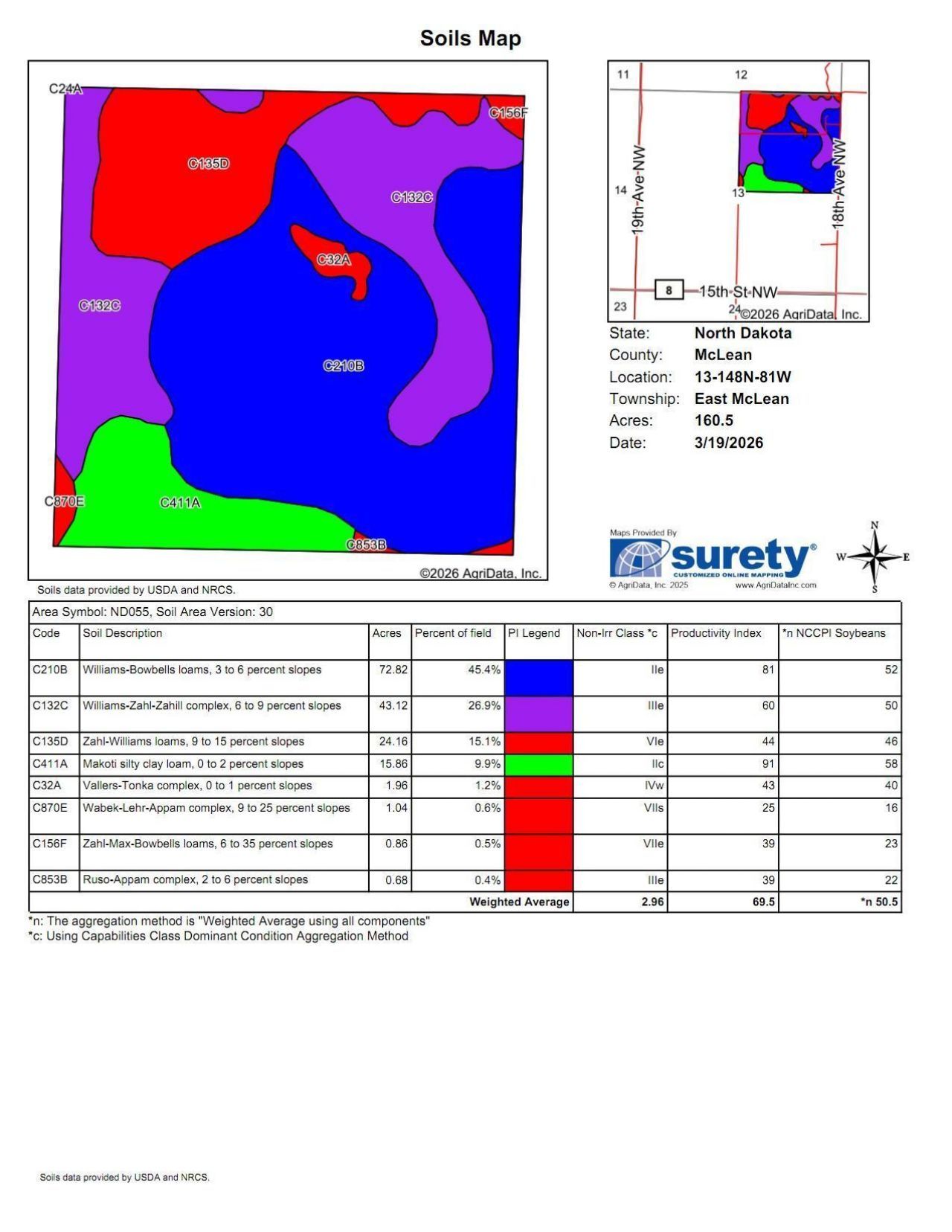 Online Auction Only starts at 9am CST on May 5, 2026 ends 2pm CST on May 7, 2026.Located approximately 7.5 miles north of Turtle Lake, North Dakota, on Highway 41, then 1 mile west on 15th St NW, and north another 1/2 mile to the south edge of the property, this McLean County offering presents a rare combination of productive agricultural land, grass, wildlife habitat, rural improvements, and outstanding recreational appeal. According to the attached USDA/FSA records for Farm 1528, the property includes 533.41 farmland acres, 295.55 cropland acres, and 295.55 DCP cropland acres, with the farm listed as active and containing 3 FSA tracts. Farm-level DCP crop data shows 10.50 base acres of wheat with a PLC yield of 27 and 26.40 base acres of oats with a PLC yield of 44, for a total of 36.90 base acres.This is a diverse central North Dakota property that offers something for nearly every type of buyer. Whether you are looking for hay ground, pasture potential, a country home base, an investment property, or a hunting-focused tract with excellent cover and habitat, this auction has the versatility to attract a wide range of bidders. The area is well known for its strong farm and ranch community, productive agricultural history, and a landscape made up of rolling topography, native grasses, wetlands, shelterbelts, ponds, and natural travel corridors for wildlife.Parcel 1 ? 160+/- AcresParcel 1 offers an attractive combination of agricultural utility, country-living potential, and recreational value. This parcel carries a Soil Productivity Index of 69.5 and an NCCPI of 50.5. It includes an older farmstead with a barn, a home consisting of 2 bedrooms, kitchen, and living room, along with a 2-stall oversized detached garage. The yard is protected by a very nice shelterbelt and hillside to the north, creating a private and functional setting. The land is currently used for agriculture and is being hayed.FSA records identify a portion of the farm as Tract 4809, which contains 54.14 farmland acres, 52.66 cropland acres, and 52.66 DCP cropland acres. The DCP crop data for Tract 4809 includes 1.90 base acres of wheat with a PLC yield of 27 and 4.70 base acres of oats with a PLC yield of 44, for a total of 6.60 base acres. FSA also notes this tract contains a wetland or farmed wetland, which adds to the natural habitat and diversity of the property. Any mineral rights owned by seller will be retained by seller.