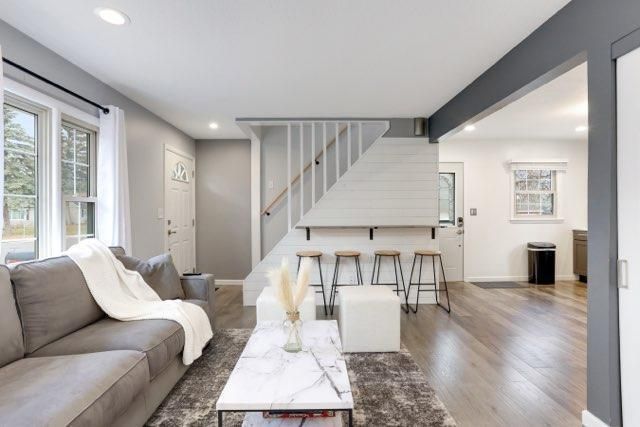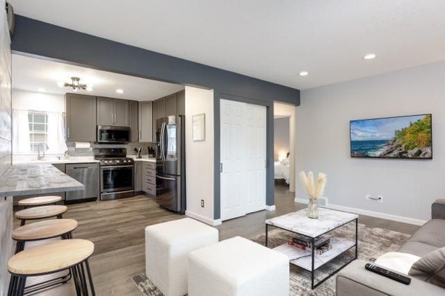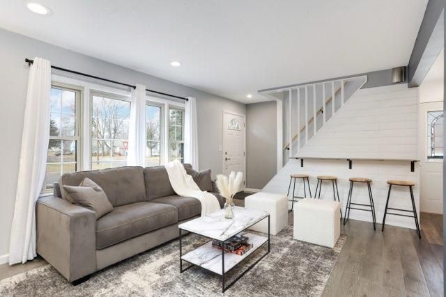 Updated 4 bedroom, 2 bathroom home with a bright, open main level and modern finishes throughout. The kitchen includes newer cabinets, stainless steel appliances, tile backsplash, solid-surface counters, and recessed lighting. The main living area features updated flooring, neutral paint, and an open connection to the dining space. Two bedrooms are located on the main floor, with additional rooms upstairs. The lower level offers a finished living area and a bathroom. Exterior highlights include a large yard and a detached garage. Convenient location with easy access to nearby amenities. Move-in ready with clean, updated spaces throughout.